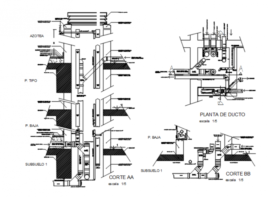 Drawing of duct details AutoCAD file which includes a plan with details of the duct, section of the duct.