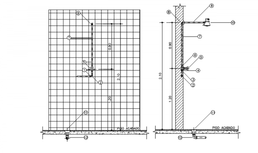 Drawing of shower detail autocad file which includes front elevation of shower fittings and side elevation of shower fittings.